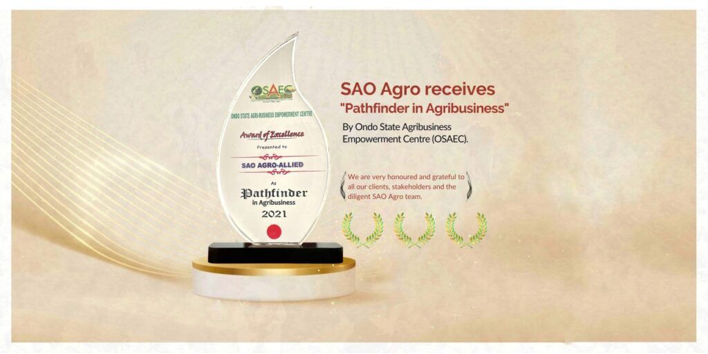 SAO Agro, a leading large-scale agricultural investment company received “The Pathfinder in Agribusiness” 2021 award which was presented to the company by the Ondo State Agribusiness Empowerment Centre (OSAEC) at the (Award for Outstanding Contribution to Agribusiness in Ondo state meeting)held on May 10, 2022, at the Cocoa Conference Hall, Governor’s office, Akure, Ondo stateThe awards ceremony brought together leading organizations, and stakeholders in the private and public sectors of the agriculture industry in Ondo state to recognize the contributions of Awardees to the development of the sector.